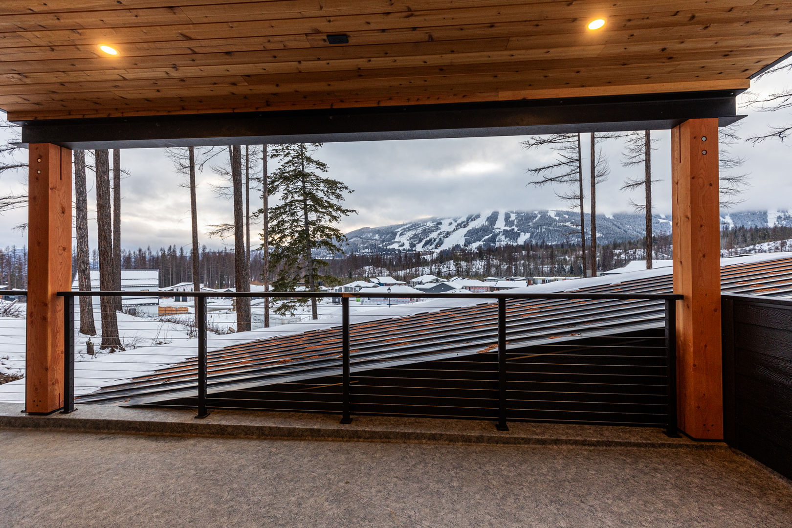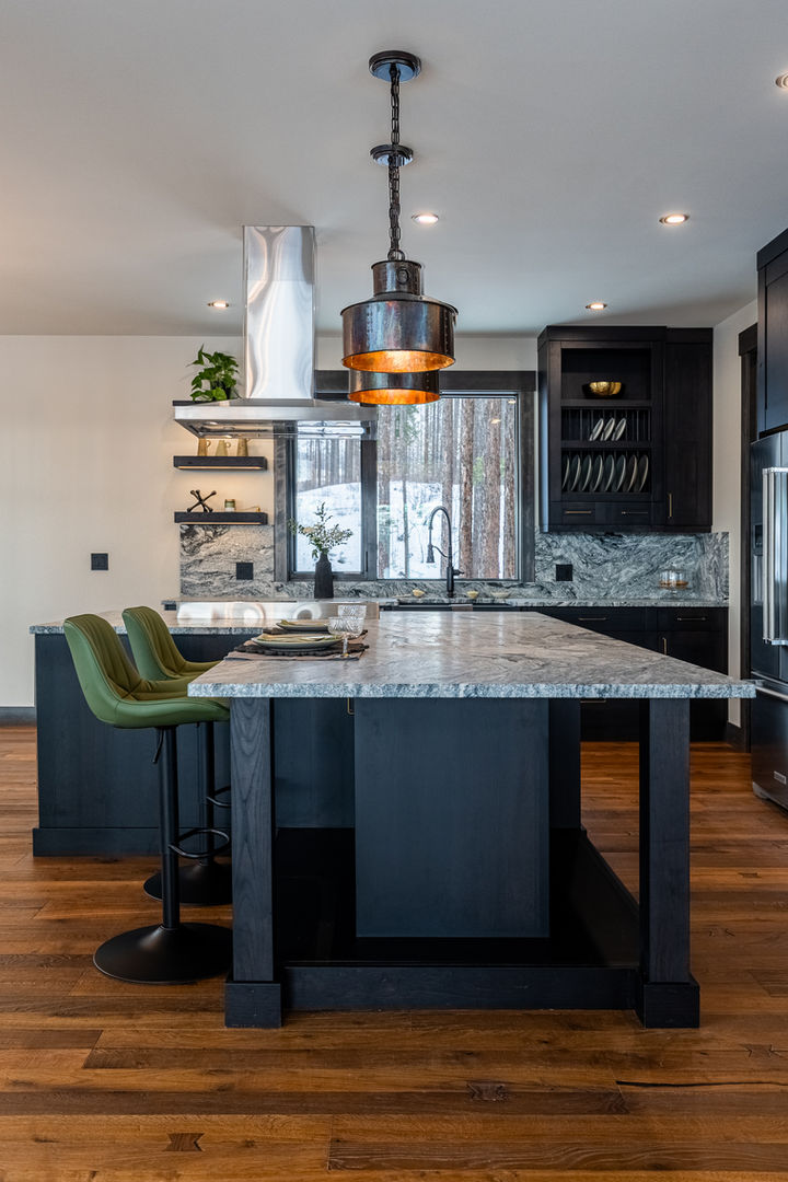 Welcome to Black Forest Vista, a stunning mountain modern home tucked in the serene surroundings of Sullivan Landing, Kimberley, BC. Set on a spacious lot framed by majestic tamarack trees, this home showcases the perfect blend of rustic charm and contemporary elegance. The exterior features eco-friendly, recycled black wood siding paired with locally sourced cedar, creating a striking natural aesthetic. Locally quarried stone enhances both the facade and the impressive interior fireplace, while fir timber beams add a touch of grandeur.