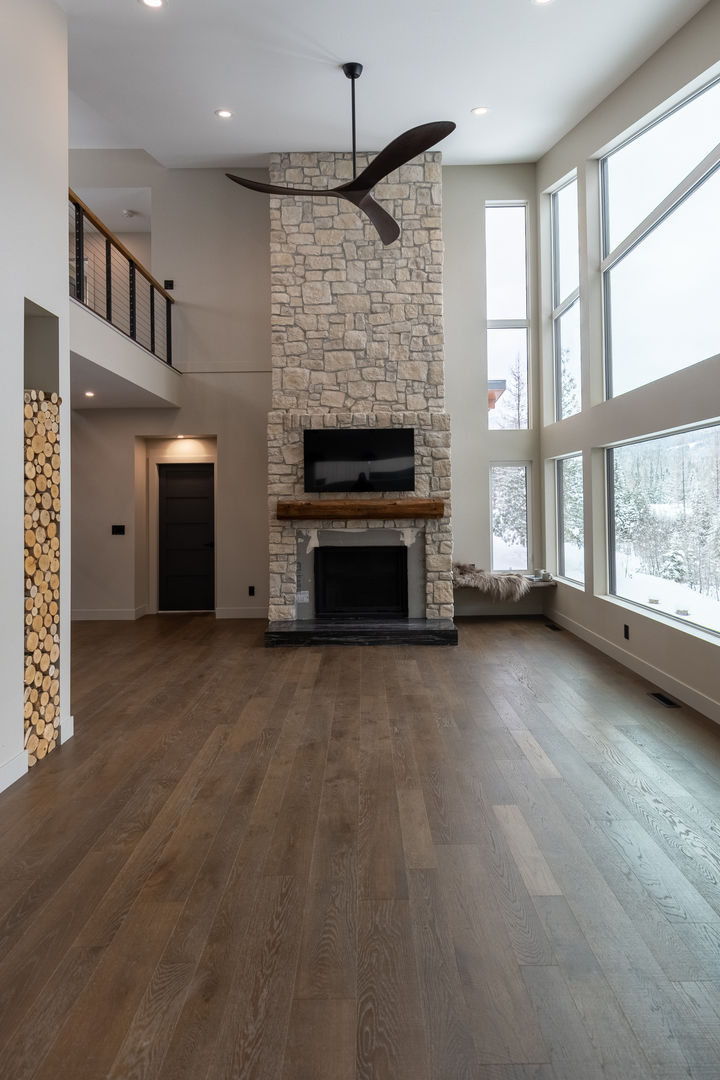 The living area centers around a cozy wood-burning fireplace framed by a limestone surround and a timber beam, creating the perfect retreat after a day on the slopes. A custom fir staircase spans all three levels, highlighted by chic cable railings and LED lighting strips on every floor.